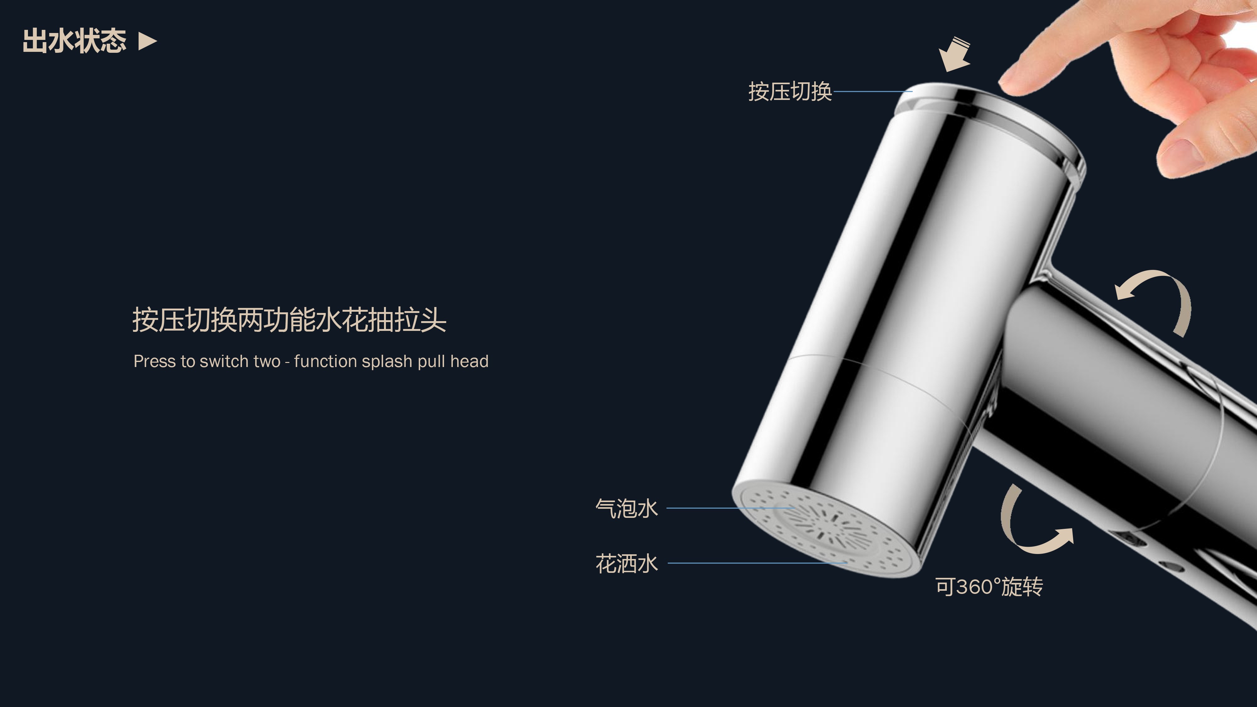 溫感三色LED燈光出水;日常洗頭利器,抽拉出水輕松洗;按壓切換兩功能水花;適合4寸3孔安裝臺面