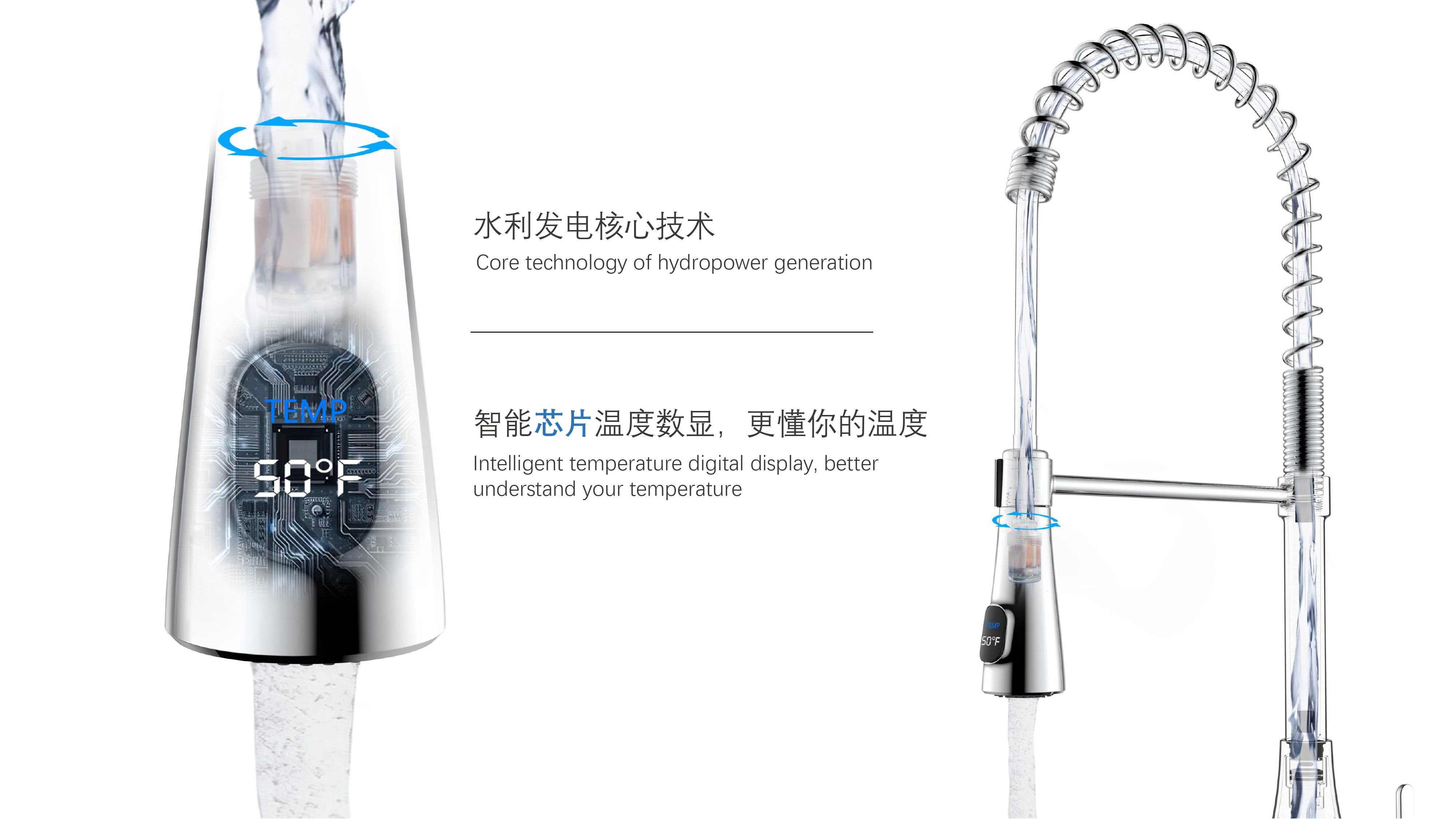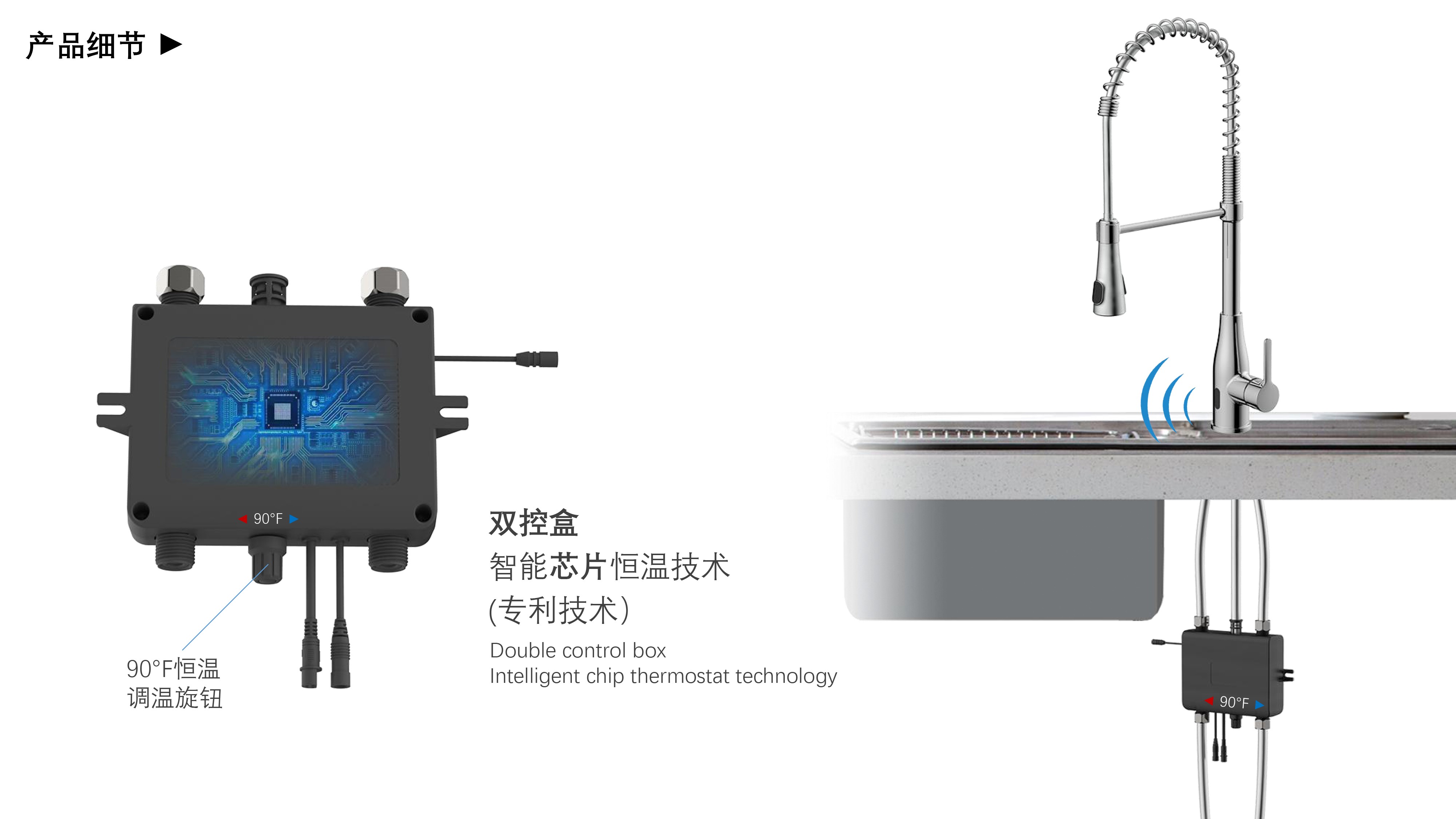 雙控廚房龍頭 ;感應(yīng)免接觸啟閉,有效感應(yīng)距離20cm;智能芯片恒溫技術(shù)雙控盒;智能芯片溫度數(shù)顯抽拉頭-冷水TEMP顯示藍(lán)色、溫水TEMP顯示綠色、熱水TEMP顯示紅色;兩種出水抽拉頭可多角度使用